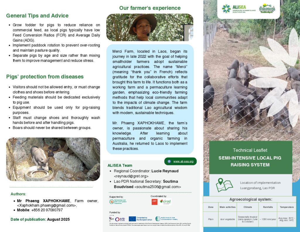 This technical leaflet provides practical guidelines and practices for establishing and managing a semi-intensive local pig raising system. It covers aspects such as housing setup, paddock fencing, feeding strategies, and crop production to support pig nutrition. Emphasizing agroecological principles, this guide promotes environmentally friendly practices that maintain soil health, biodiversity, and resource efficiency. Designed for small to medium-scale farmers, the leaflet aims to optimize animal welfare, improve feed efficiency, and enhance farm productivity through cost effective and well-planned methods.