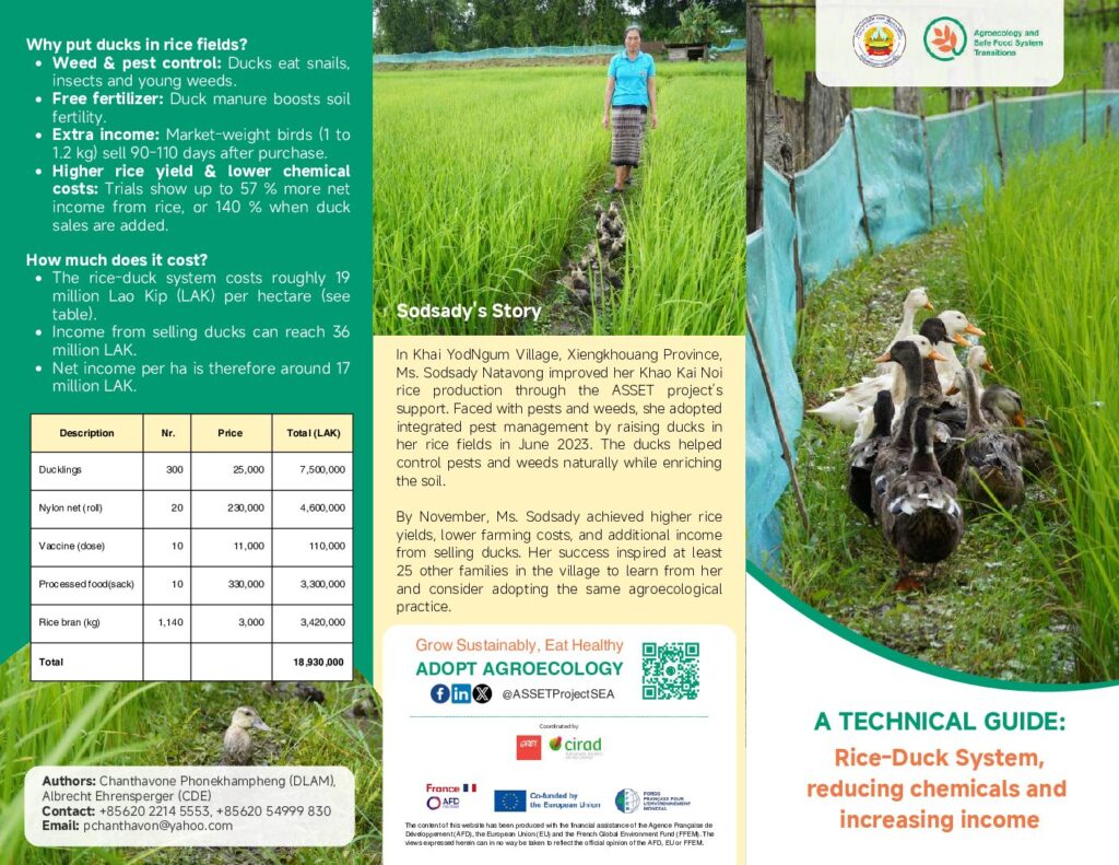 The technical leaflet introduces the rice–duck system, an agroecological practice that reduces chemical use by allowing ducks to control pests and weeds while naturally fertilizing the soil. It outlines the system’s economic benefits, showing how farmers can increase rice yields and earn additional income from duck sales. The leaflet also provides practical guidance, timelines, and cost estimates to support successful adoption.