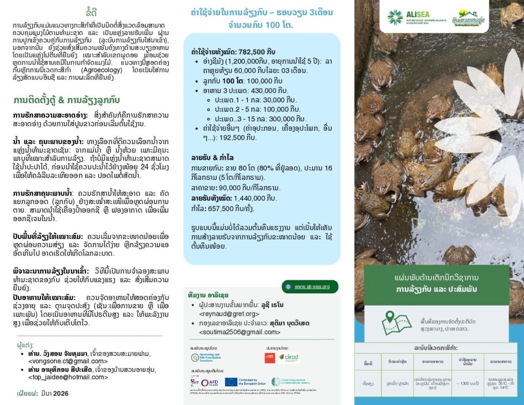 This ALiSEA leaflet provides essential information on the breeding, rearing, and feeding of frogs in both commercial and breeding environments. It covers key aspects such as selecting breeding frogs, managing water quality, feeding practices, and ensuring healthy growth. By following these guidelines, you can ensure optimal conditions for frog development and production.