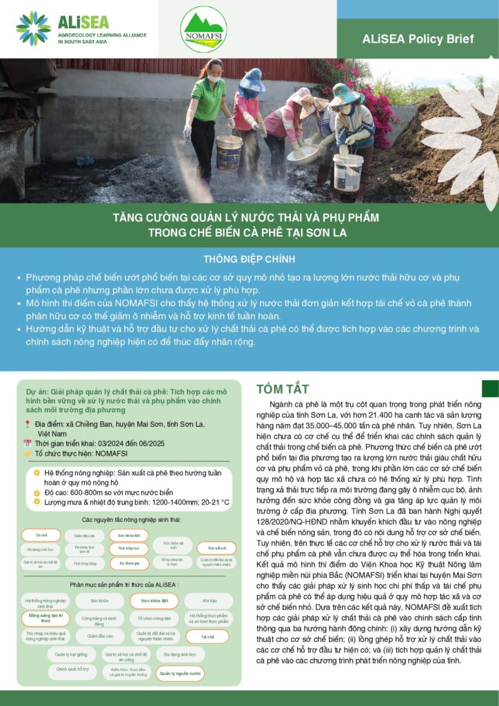 Ngành cà phê là một trụ cột quan trọng trong phát triển nông nghiệp của tỉnh Sơn La, với hơn 21.400 ha canh tác và sản lượng hàng năm đạt 35.000–45.000 tấn cà phê nhân. Tuy nhiên, Sơn La hiện chưa có cơ chế cụ thể để triển khai các chính sách quản lý chất thải trong chế biến cà phê. Phương thức chế biến cà phê ướt phổ biến tại địa phương tạo ra lượng lớn nước thải giàu chất hữu cơ và phụ phẩm vỏ cà phê, trong khi phần lớn các cơ sở chế biến quy mô hộ và hợp tác xã chưa có hệ thống xử lý phù hợp. Tình trạng xả thải trực tiếp ra môi trường đang gây ô nhiễm cục bộ, ảnh hưởng đến sức khỏe cộng đồng và gia tăng áp lực quản lý môi trường ở cấp địa phương. Tỉnh Sơn La đã ban hành Nghị quyết 128/2020/NQ-HĐND nhằm khuyến khích đầu tư vào nông nghiệp và chế biến nông sản, trong đó có nội dung hỗ trợ cơ sở chế biến. Tuy nhiên, trên thực tế các cơ chế hỗ trợ cho xử lý nước thải và tái chế phụ phẩm cà phê vẫn chưa được cụ thể hóa trong triển khai. Kết quả mô hình thí điểm do Viện Khoa học Kỹ thuật Nông lâm nghiệp miền núi phía Bắc (NOMAFSI) triển khai tại huyện Mai Sơn cho thấy các giải pháp xử lý sinh học chi phí thấp và tái chế phụ phẩm cà phê có thể áp dụng hiệu quả ở quy mô hợp tác xã và cơ sở chế biến nhỏ. Dựa trên các kết quả này, NOMAFSI đề xuất tích hợp các giải pháp xử lý chất thải cà phê vào chính sách cấp tỉnh thông qua ba hướng hành động chính: (i) xây dựng hướng dẫn kỹ thuật cho cơ sở chế biến; (ii) lồng ghép hỗ trợ xử lý chất thải vào các cơ chế hỗ trợ đầu tư hiện có; và (iii) tích hợp quản lý chất thải cà phê vào các chương trình phát triển nông nghiệp của tỉnh.