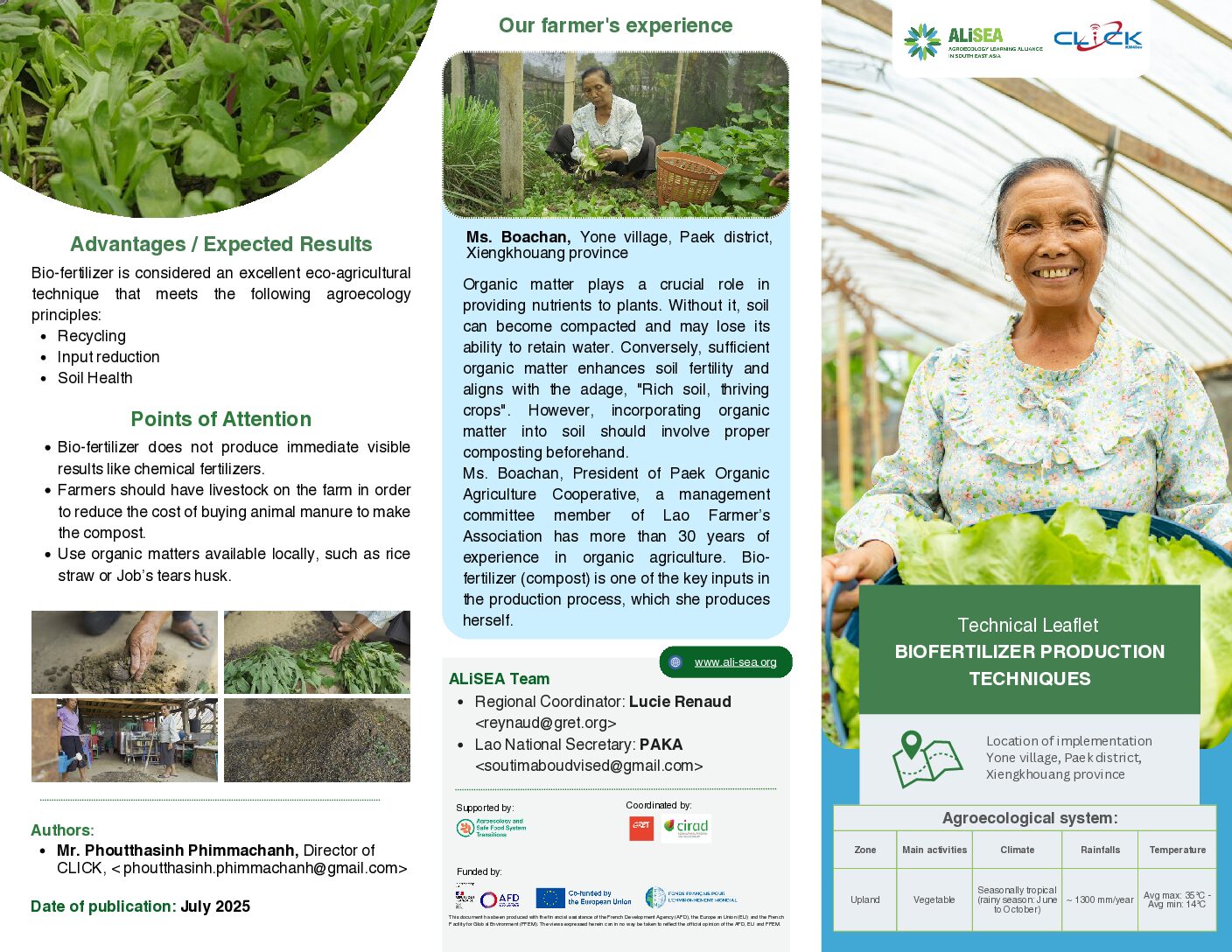 The resource explains biofertilizer production in Yone village, Xiengkhouang Province, based on farmer experience. It highlights compost as a key input for soil health, recycling, and reducing chemical use. The process involves mixing dry animal manure with burnt rice husks, adding bran and optional legumes, and fermenting with a sugar-based bio-extract for about seven days. Proper storage ensures quality for up to a year. Application rates depend on soil quality, with compost gradually improving fertility over time, allowing reduced quantities in subsequent years.