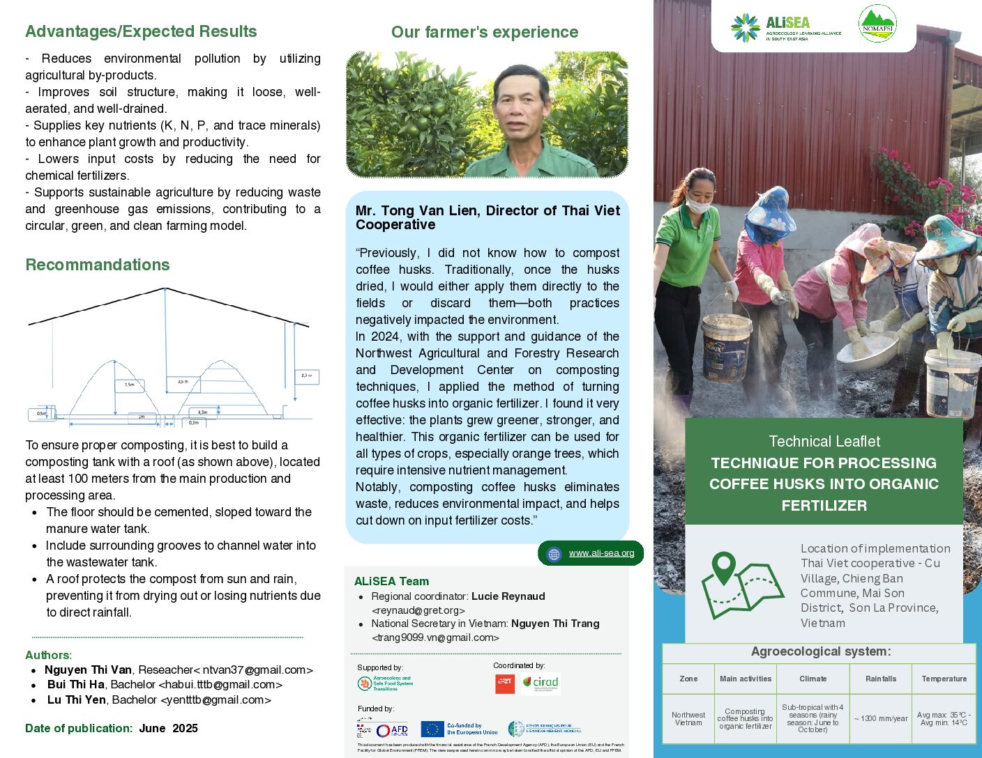 This leaflet explains how farmers in northwest Vietnam process coffee husks into organic fertilizer. It details the benefits—improved soil health, reduced environmental pollution, lower fertilizer costs, and support for sustainable farming—and provides step-by-step guidance on composting. The method involves mixing coffee husks with manure, lime, phosphate, urea, and a microbial solution, ensuring proper moisture, and covering the pile to retain nutrients. It was published in June 2025 by NOMAFSI with ALiSEA support, based on a successful farmer experience.