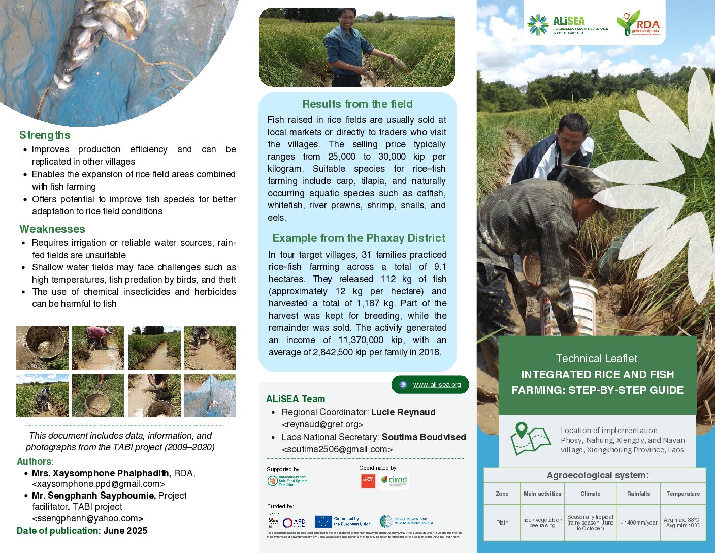 This June 2025 technical leaflet from Rural Development Association (RDA) in Laos is a step-by-step guide to integrated rice–fish farming, explaining how to prepare fields, choose suitable rice and fish species, manage stocking, feeding, and maintenance, and outlining benefits, challenges, and field results from pilot villages.