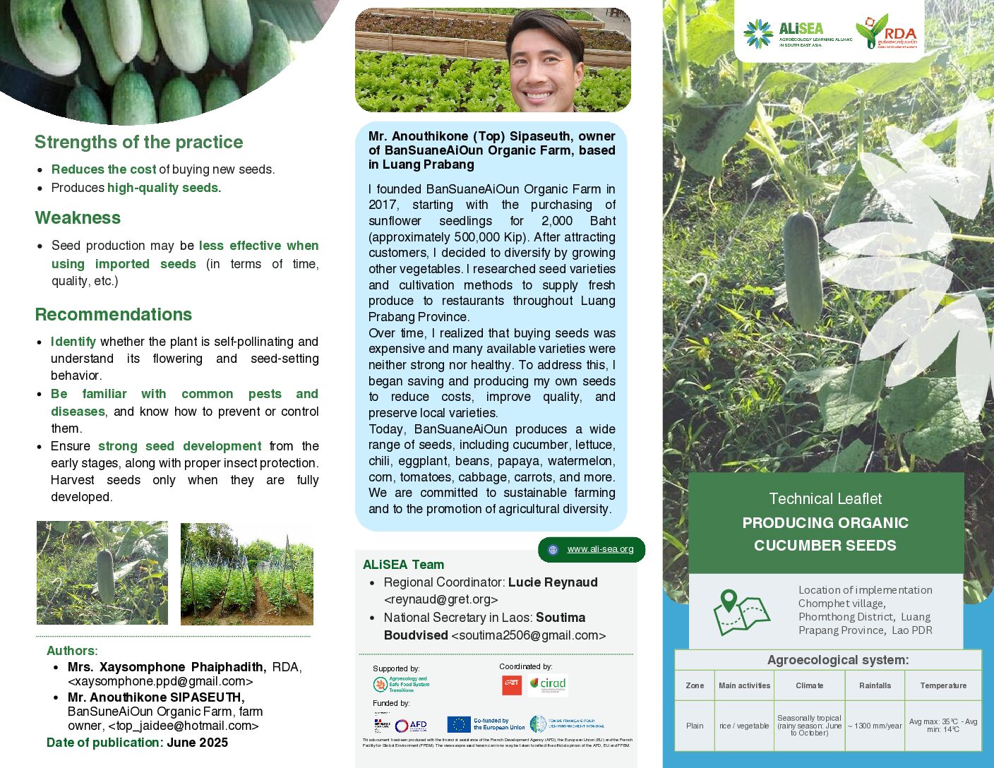 This June 2025 technical leaflet presents BanSuaneAiOun Organic Farm’s method for producing organic cucumber seeds. It explains how on-farm seed production reduces costs, preserves traditional varieties, and improves quality. The guide details optimal growing conditions, land preparation, planting, watering, pest management, and seed collection, yielding 100–150 seeds per fruit. It emphasizes using organic fertilizers, protecting against pests, harvesting fully mature cucumbers, and storing seeds properly to ensure sustainability and local seed diversity.