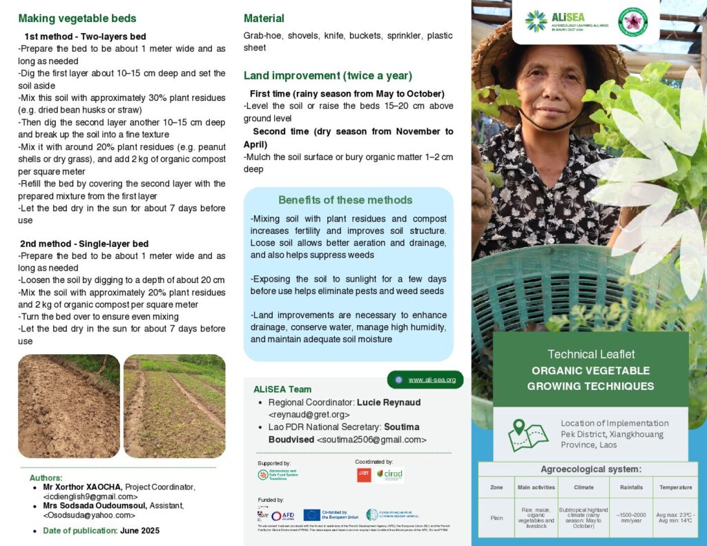 The leaflet provides practical guidance on organic vegetable cultivation in Pek District, Xiangkhouang Province, Laos. It describes the local subtropical highland climate and outlines methods for improving soil fertility and structure through compost and plant residues, managing pests with sun exposure, and ensuring proper drainage and moisture. It explains two bed preparation techniques, seasonal land improvements, mulching for weed suppression and moisture retention, and watering schedules adapted to seasonal conditions. The guide also covers organic fertilization, crop rotation to reduce pests and diseases, sowing and transplanting methods, integrated cropping for sustainability, and best practices for harvesting to maintain vegetable freshness.