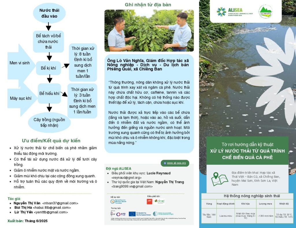 Tài liệu này trình bày quy trình kỹ thuật xử lý nước thải phát sinh từ chế biến cà phê quả tươi thông qua hệ thống kết hợp kỵ khí và hiếu khí. Giải pháp giúp giảm ô nhiễm môi trường, hạn chế mùi hôi, đồng thời cho phép tái sử dụng nước sau xử lý trong tưới tiêu nông nghiệp. Mô hình góp phần nâng cao hiệu quả sản xuất và tuân thủ các quy định về bảo vệ môi trường trong vùng sản xuất cà phê.